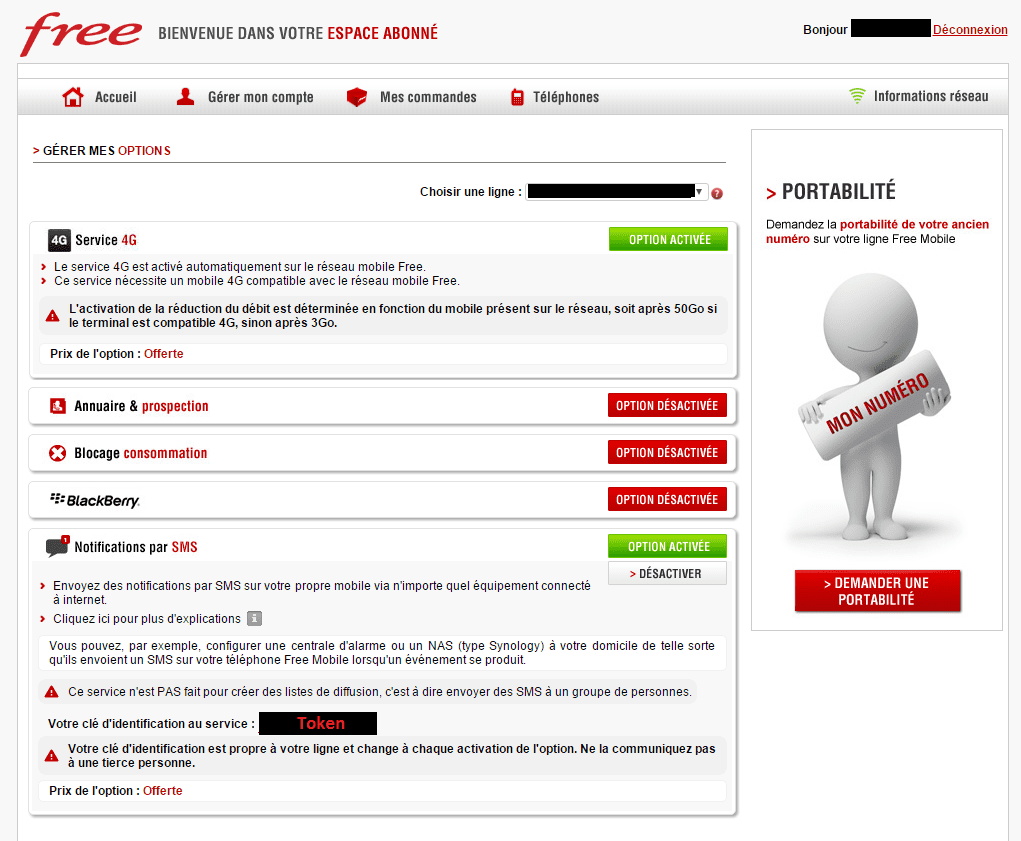 Before doing anything, you have to activate the SMS API option in your Free Mobile account (In “Gérer mon compte -> Mes Options”). Activating this option will automatically generate a token which is required in your configuration.