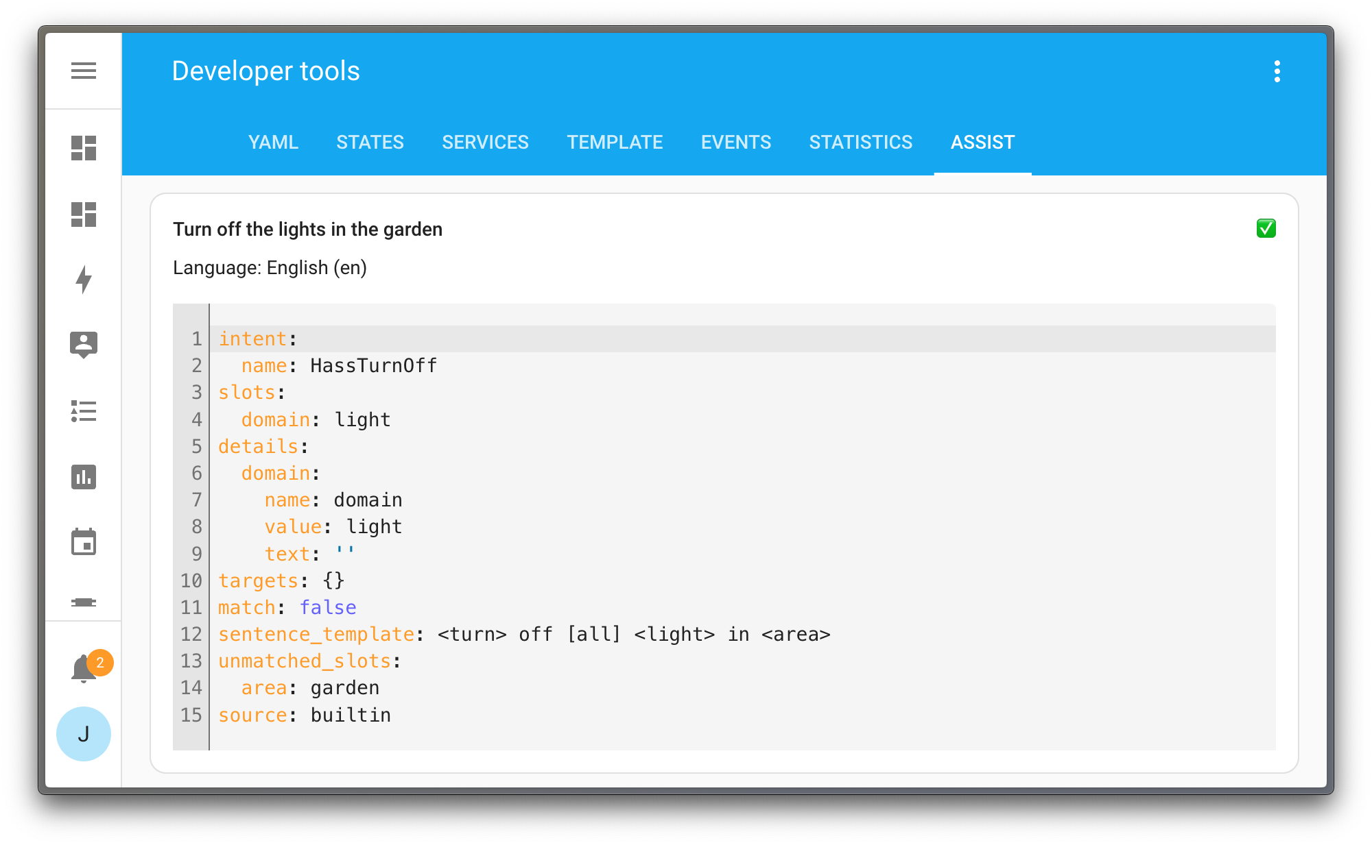 If you are still having problems, the Assist debug tool has also been improved. Using the tool, you see how Assist is interpreting a sentence, including any missing pieces.