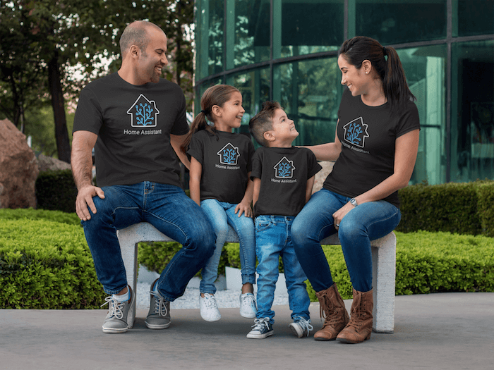 Family of 4 on a bench wearing the new black Home Assistant shirt.