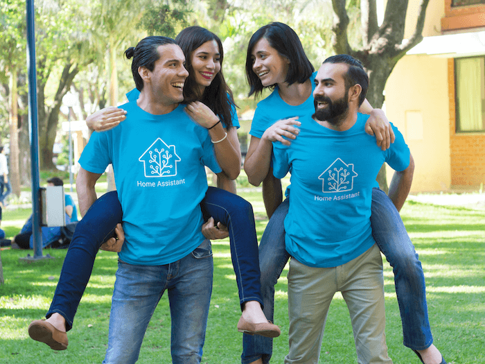 Two men carrying two women and the new blue Home Assistant shirt.