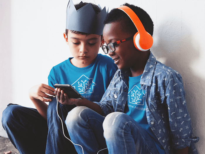 Cool kid listening to music + sidekick. Both wearing the new blue Home Assistant shirt.