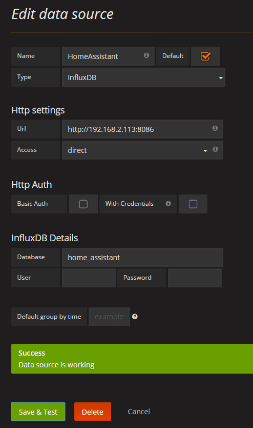 root) and add your first data source. Here’s how you can configure Grafana to use InfluxDB database. Note that 192.168.2.113 is the IP address of my NAS.