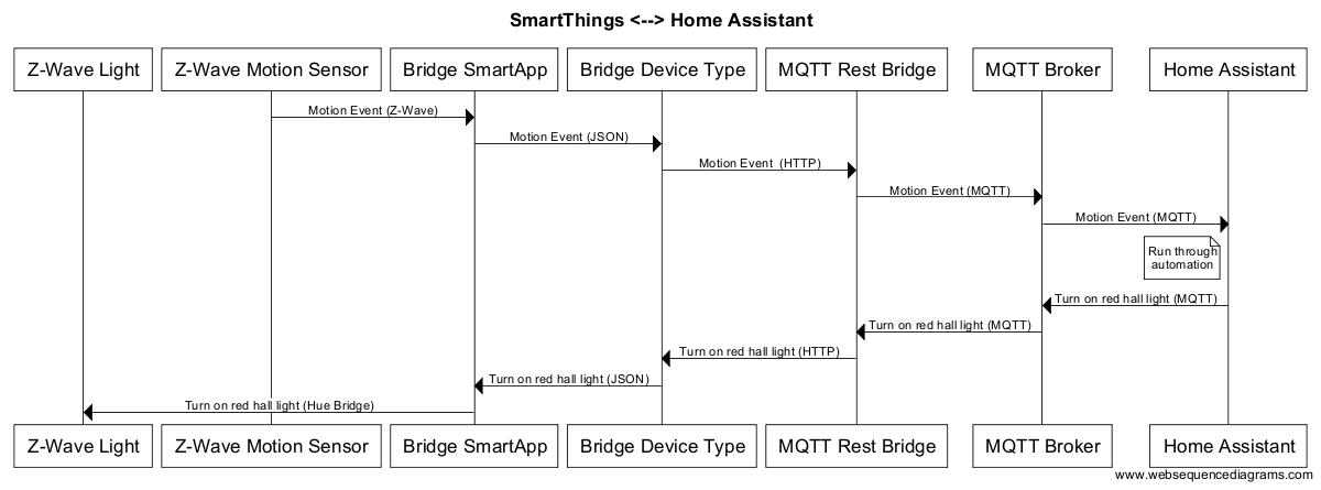 On the Home Assistant side, there is a powerful platform available based on the MQTT lightweight message bus protocol. Everything from lights to switches to temperature sensors can be defined in Home Assistant as an MQTT component, so it makes for a convenient integration point. This requires an MQTT broker for handling the message bus, and one last piece to translate between the HTTP that SmartThings supports and MQTT.