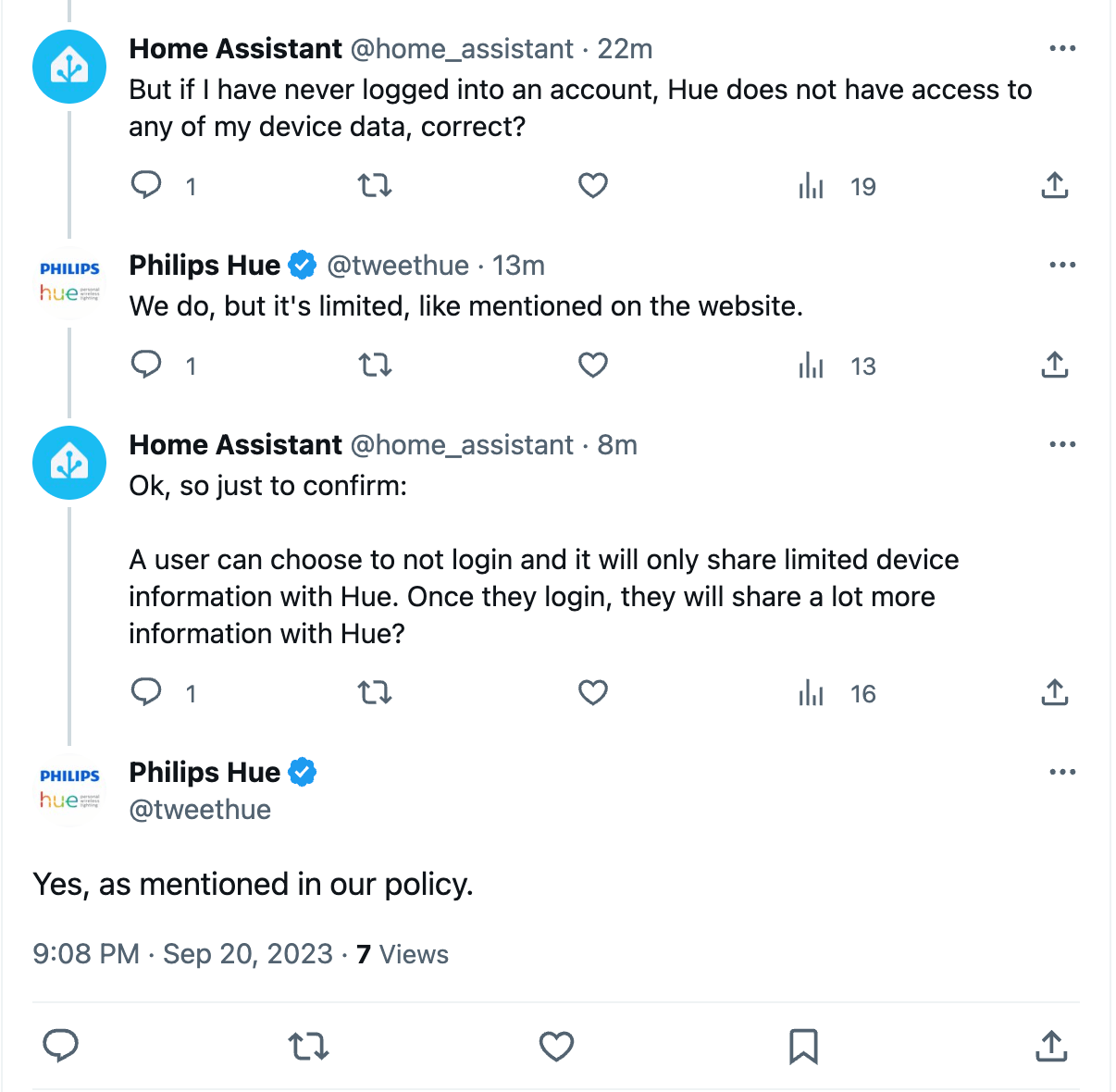 Currently Philips Hue is announcing this change in their app and users are not forced yet to turn over all their data. We have contacted Signify privately to bring this issue to their attention but they have not responded.