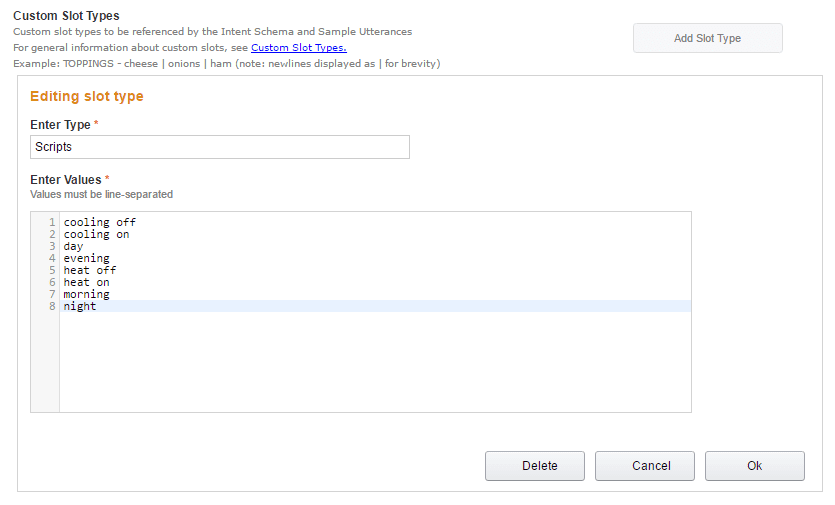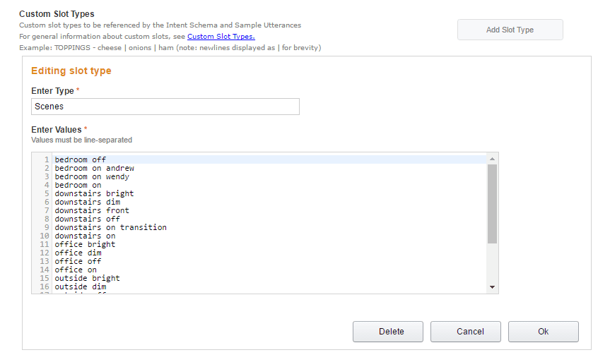Then create a custom slot type called Scenes listing every scene you want to control: