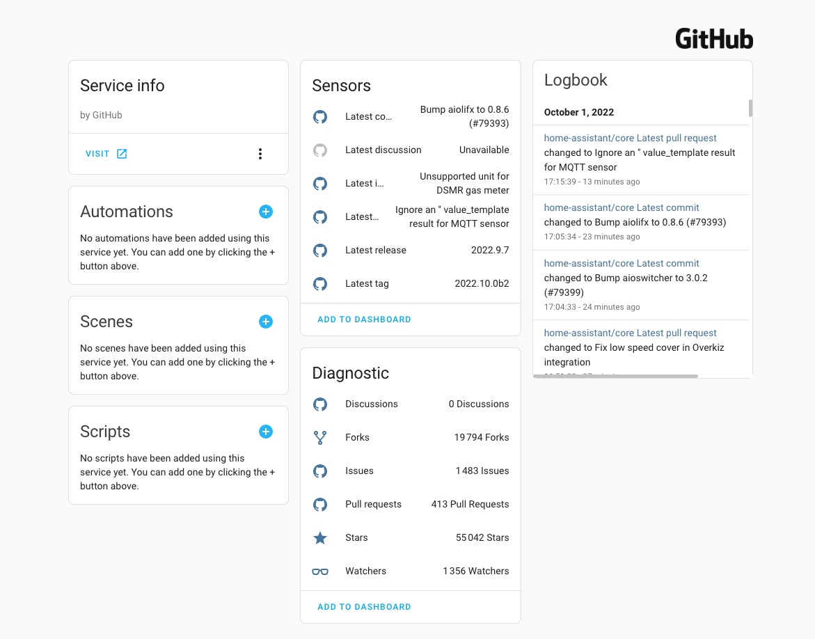 The GitHub integrationIntegrations connect and integrate Home Assistant with your devices, services, and more. [Learn more] allows you to monitor your favorite GitHub public repositories.