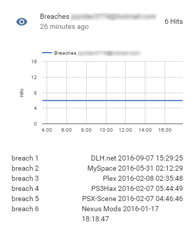 If one of your email accounts is breached the sensor will display breach meta data. It will list the title of the site where your email account has been breached as well as the added date of the breach data. This data is displayed in descending order so that the state attribute breach 1 will always contain the last known breach for the specific email account, if there are any breaches detected.