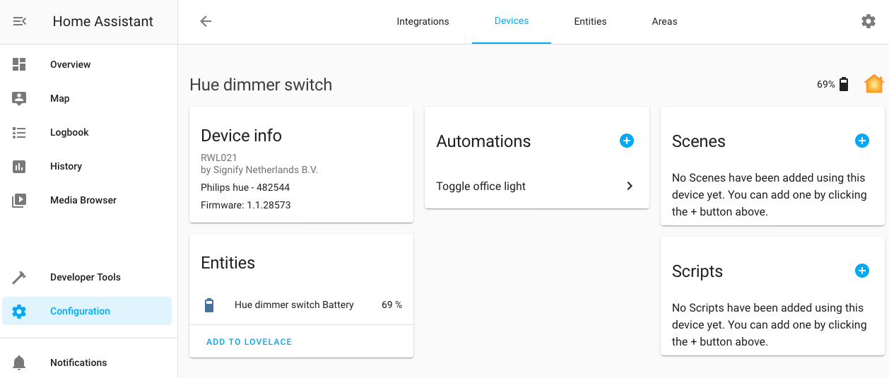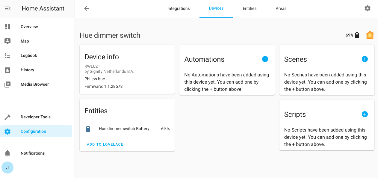 For example, to add a new automation that is triggered by one of these devices go to the device registry UI and find the device you want to use as a trigger. Click on it to reveal the device registry entry for it. You will be able to see the devices model, manufacturer and firmware version. You might see related entities - like a battery sensor.
